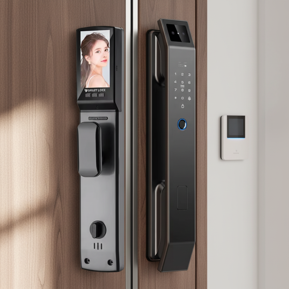 Serrure intelligente 9-en-1 à reconnaissance faciale, empreinte digitale, mot de passe, carte IC, clé, application, code WeChat + sonnette | Tuya Cloud Aluminium Grade C
