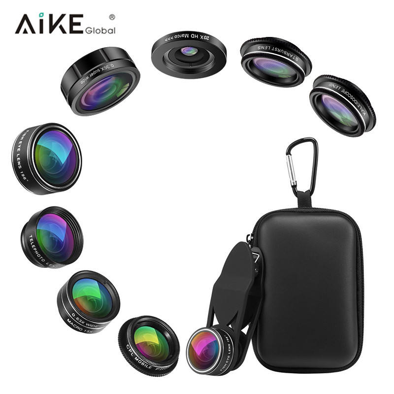 Kit d'objectifs pour téléphone en verre optique 9 en 1 avec objectifs fisheye/macro/Grand angle, filtre polarisant pour smartphones Android et IOS