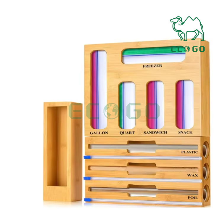 9 in 1 Wooden Drawer Organizers With Plastic Foil Wrap Dispenser Holder Bamboo Ziplock Bag Storage