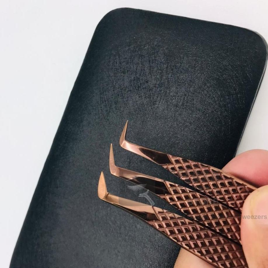 Pince à cils en acier inoxydable or rose mince à 90/45 degrés avec poignée en diamant à pointe pointue pour l'extension de cils en grande quantité