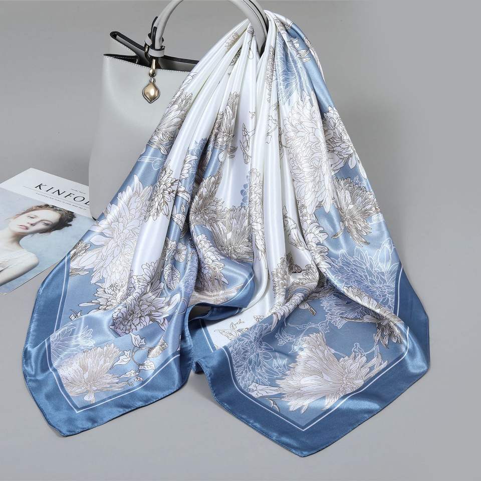 Foulard carré de luxe 90x90 cm en satin imprimé numérique, 100% soie, avec logo, pour femme, finition satinée