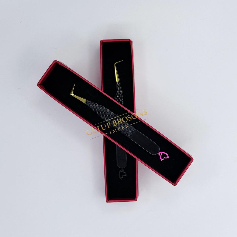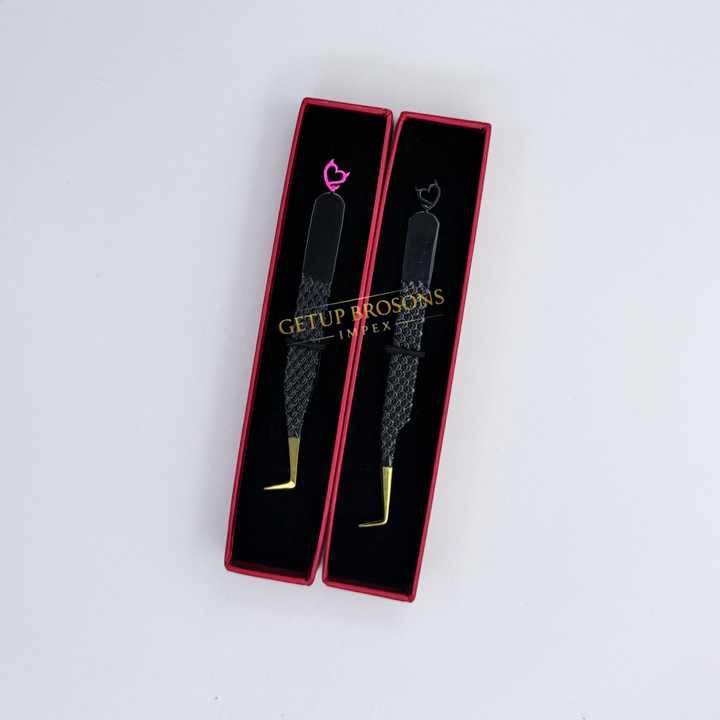Pince à épiler professionnelle pour extensions de cils, à 90 degrés, en acier inoxydable, revêtement noir, pointe dorée, design cœur de démon