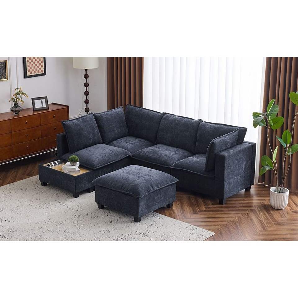 Canapé modulable en forme de U de 90 pouces avec pouf mobile et table basse Canapé de salon bleu avec dispositifs de charge cachés