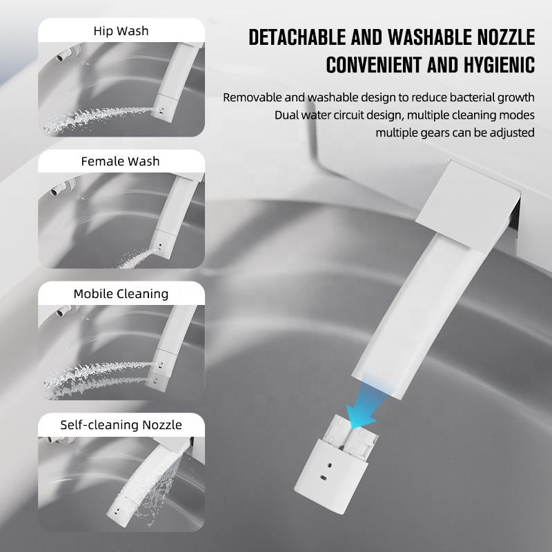 Sesiège de chauffage, Nuit lumière, Type de chauffage instantané, Pied capteur flush, Conception de siège plus large, Buse autonettoyante, Lave-femme, Nettoyage de la buse mobile, Séchage à l'air chaud, Lavage de Fesses, Réglage de la température de l'eau, Réglage de la pression de l'eau, Télécommande