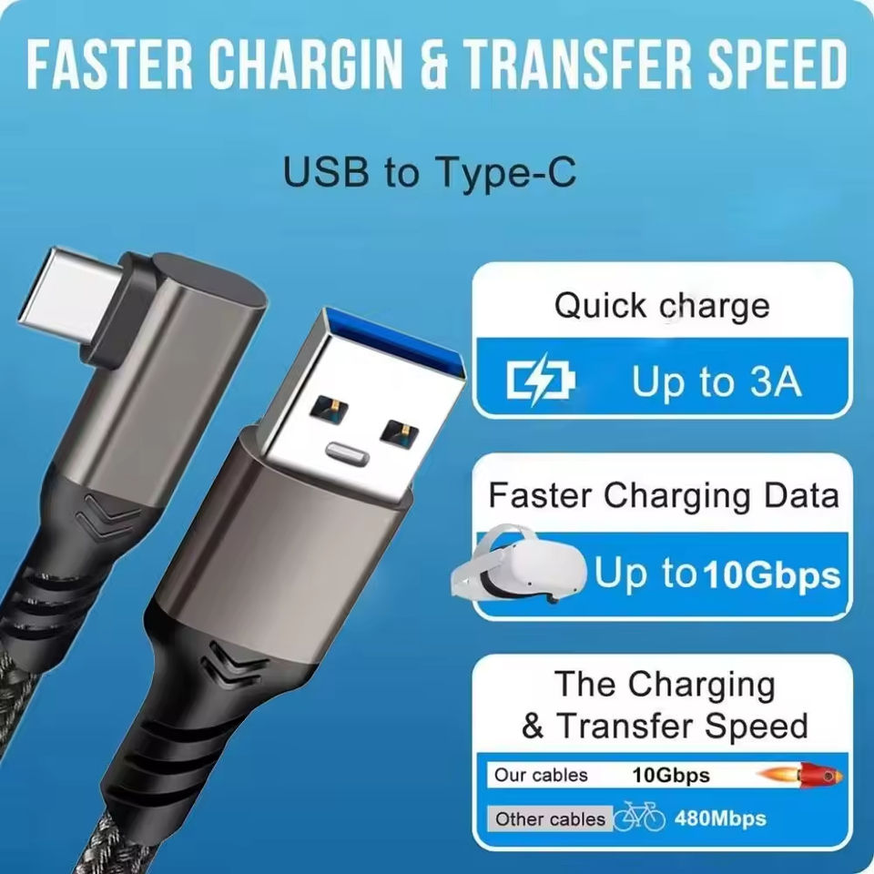 Câble USB 3.2 Gen 2 à 90 degrés, 10 Gbps, USB A vers USB C, 60 W, 3 A, type C, câble de charge ultra rapide pour appareil photo, Oculus/Quest 3 VR Link