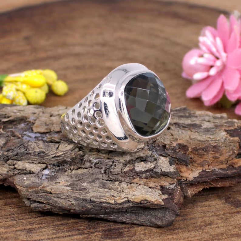 92.5 Sterling Silver Hip Hop Style Ring Smoky Quartz Gemstone Rhodium Plated Oval Cut Geometric Pattern Invisible Platinum Fine