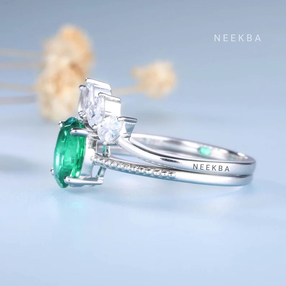 Ensemble de bagues de mariée 2 pièces en argent 925-Bague de fiançailles en émeraude de forme ovale et alliance incurvée cloutée Moisaanite