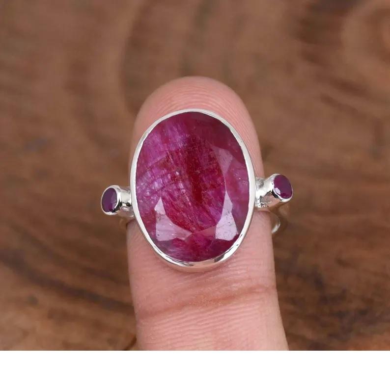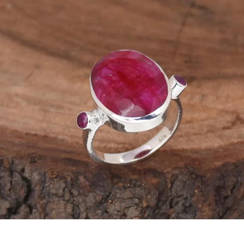 925 Silver Ruby Ring with Triple Stone Bohemian Style Engagement Gift Christian Religious Gemstone Ring