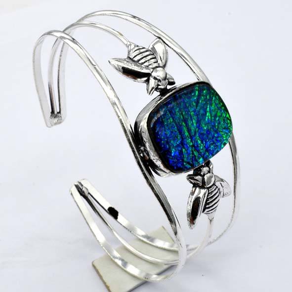 Brass Adjustable Handmade Blue Triplet Opal Gemstone Vintage Fashion Bangle Original Antique Design Jewelry for Anniversary