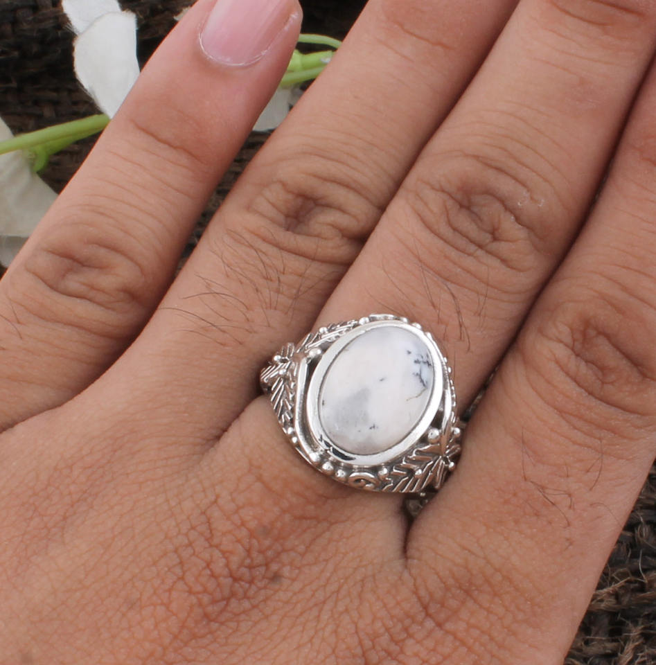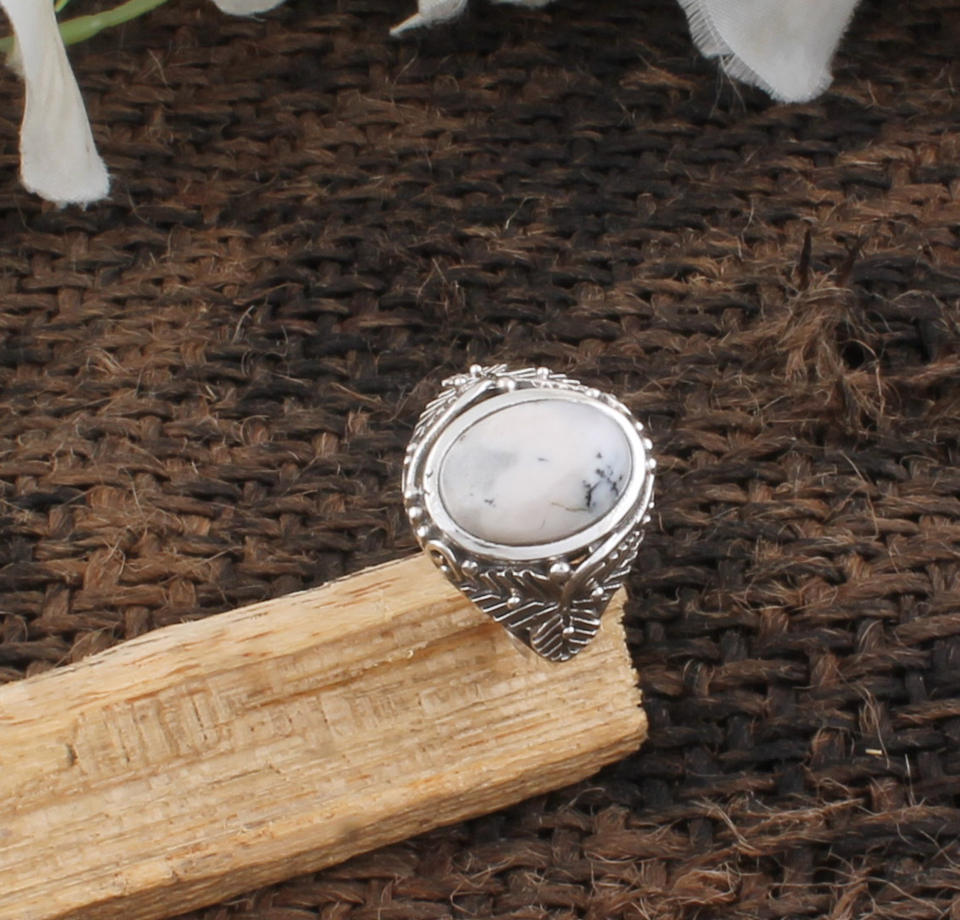 Bague Solitaire Classique Bohème Faite à la Main en Argent Sterling 925 avec Opale Dendritique Taillée Brillant et Sertie en Bezel, Unisexe