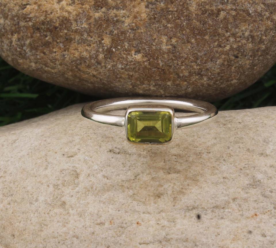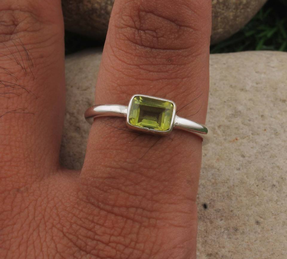 Bague de mariage solitaire classique bohème délicate en argent sterling 925 avec serti clos et péridot naturel taillé à la main, certifiée par une tierce partie