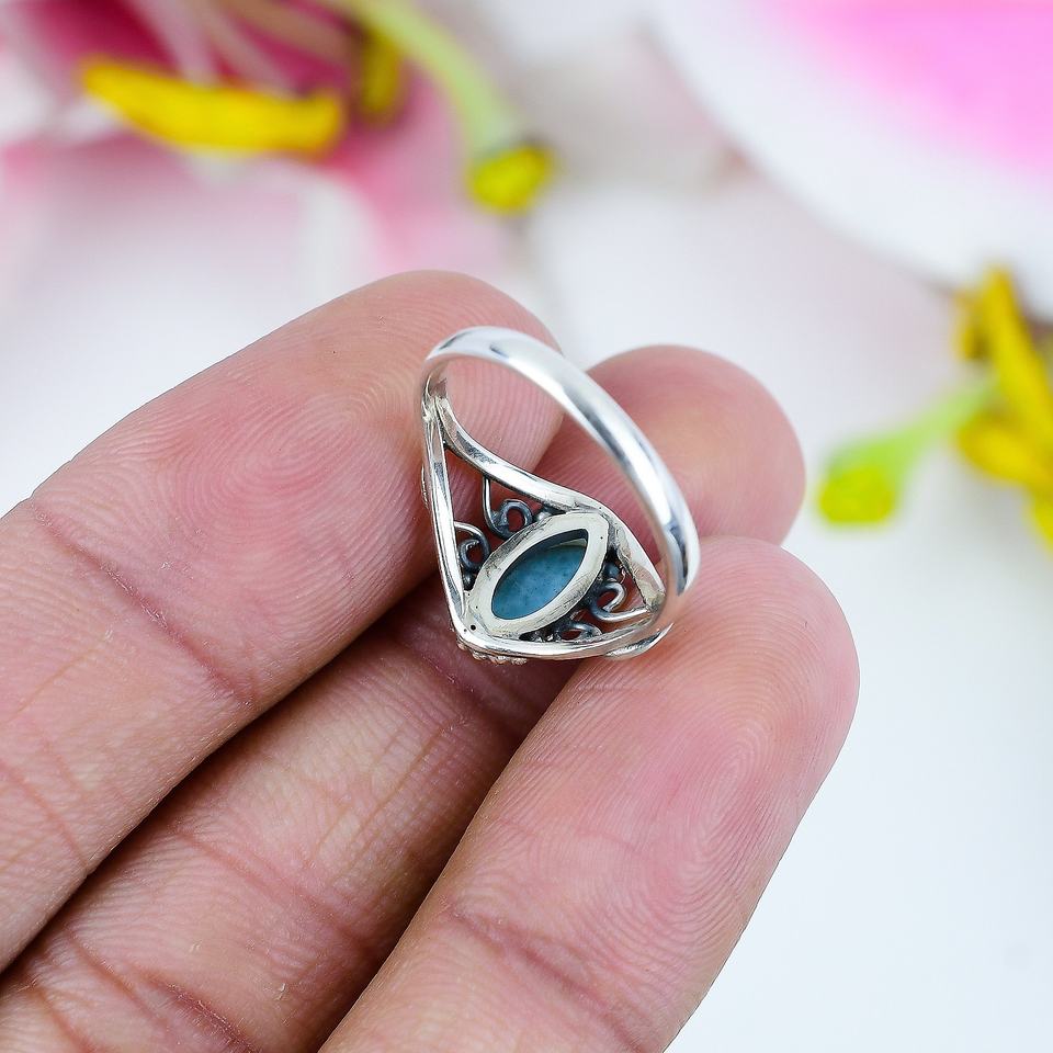 Bague en argent avec larimar naturel | Bague en argent sterling 925 avec pierre précieuse marquise en larimar | Bijoux vintage faits à la main