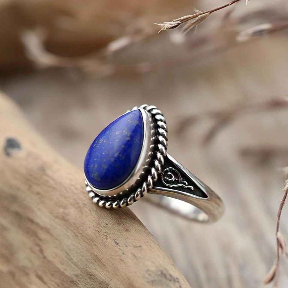 925 Sterling Silver Boho Vintage-Inspired Handmade Statement Ring Natural Lapis Lazuli Pear Gemstone Fine Bohemian Jewelry
