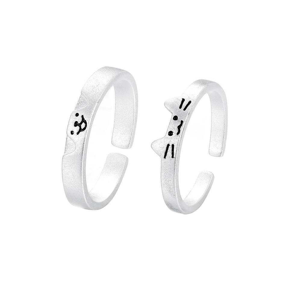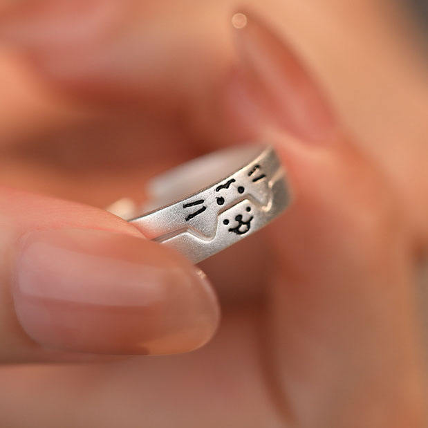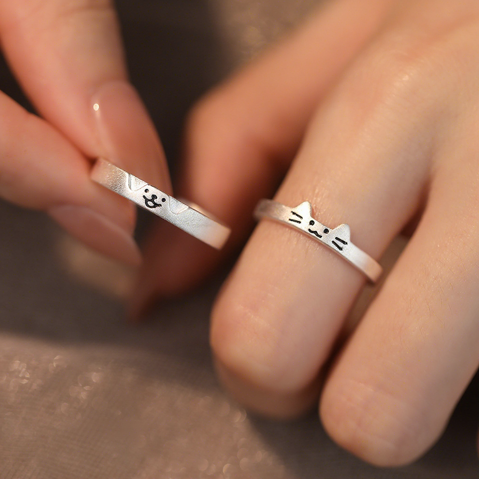 925 Sterling Silver Cat and Dog Cute Couple Rings Personalized Style Cute Overlapping Pair Adjustable Rings Silver Jewelry