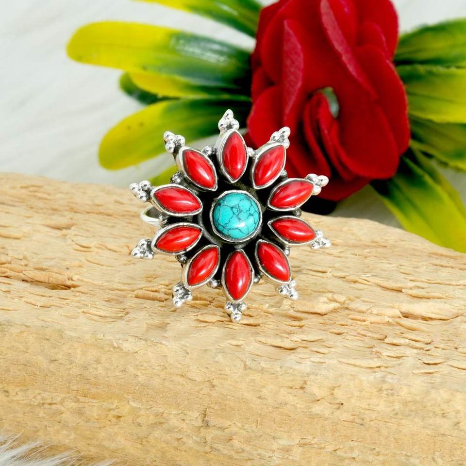 Bague fine en argent sterling 925 avec motif de fleur turquoise et corail naturel R0139-GS