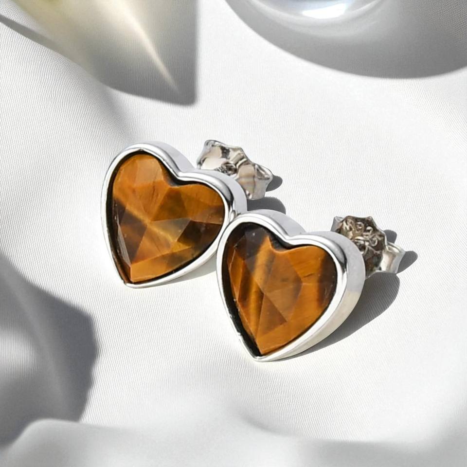 925 Sterling Silver Heart Shape Collet Tiger Eye Gemstone Studs Boucles d'oreilles Bijoux