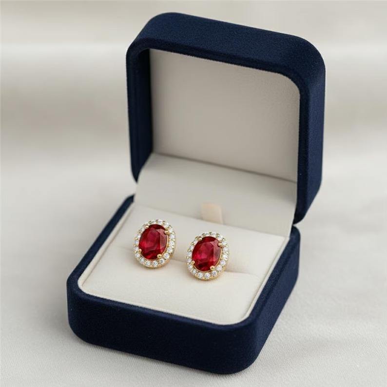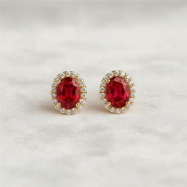 Boucles d'oreilles ovales en argent sterling 925 avec rubis de laboratoire et halo de diamants moissanite, faites à la main