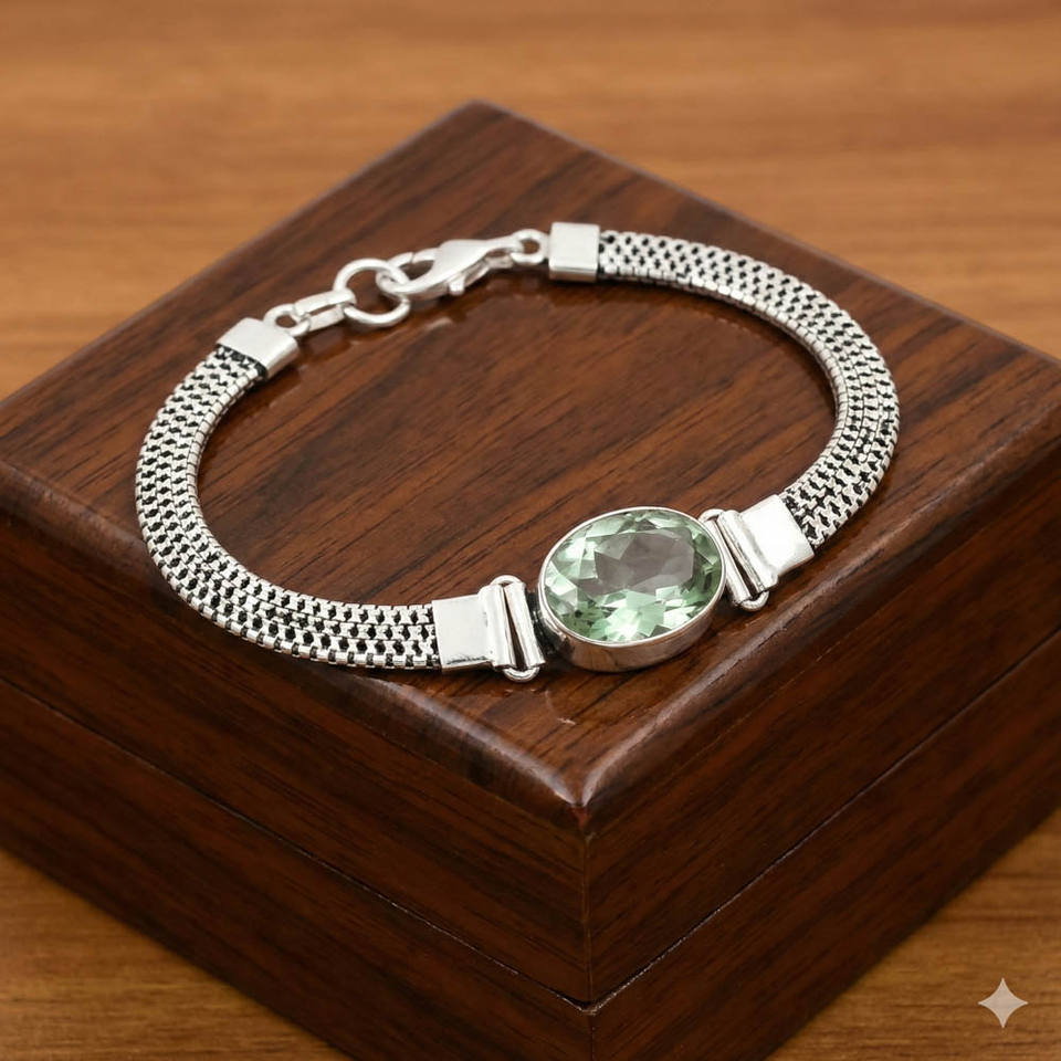 Bracelet chaîne bohème fait main en argent sterling 925 plaqué rhodium pour femme, avec améthyste verte taille ovale sertie clos, idéal pour les fêtes