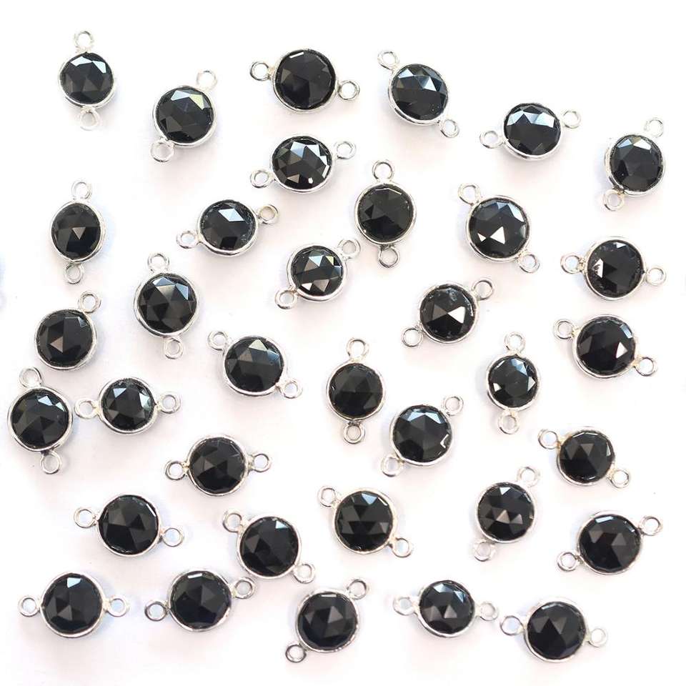 Connecteur plaqué argent avec lunette argentée de forme ronde en onyx noir
