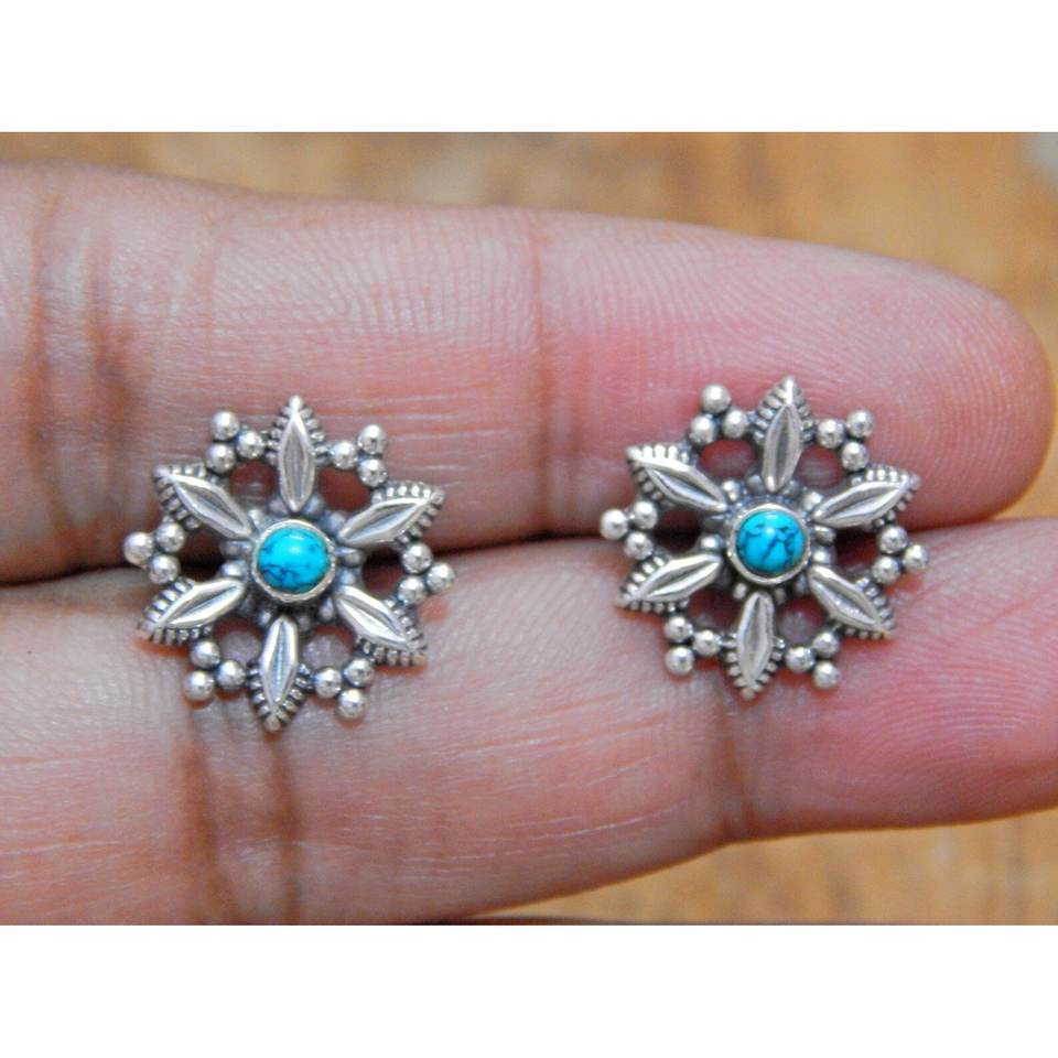 925 Sterling Silver Vintage Style Turquoise Stud Earrings Dainty Flower Studs with Genuine Turquoise Gemstone