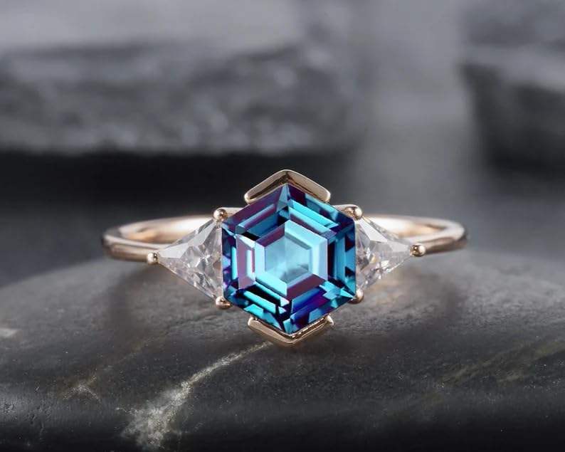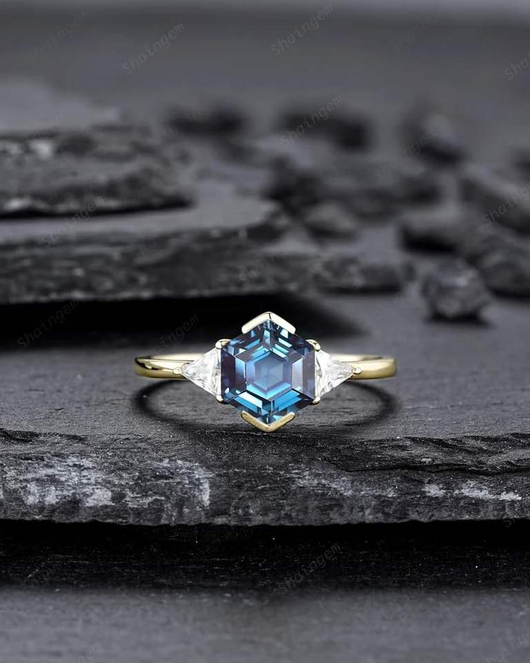 925 Sterling Silver Yellow Gold Plating Triangle Moissanite Hexagon Cut Alexandrite Engagement Bezel Three Stone Wedding Ring
