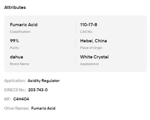 Acide fumarique E297 de qualité alimentaire à 99% de pureté pour additif acidifiant des aliments et des boissons, matière première
