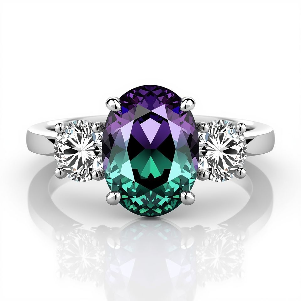 Bague en or massif 9K avec trois pierres : Alexandrite de laboratoire ovale et diamant de laboratoire taille marquise – Joaillerie fine