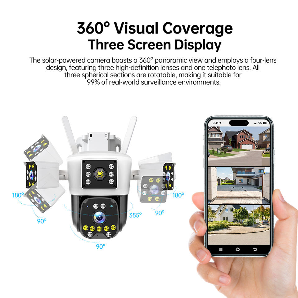 Caméra de sécurité solaire 4G PTZ 9MP pour ferme/chantier, 3 objectifs, 3 écrans, vision nocturne couleur, IP66