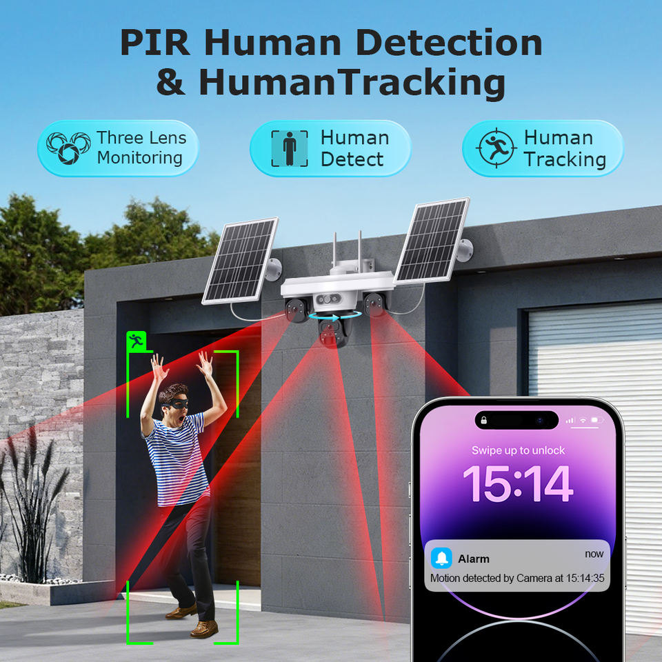 Caméra de sécurité solaire PTZ 9MP à trois objectifs, triple vue, enregistrement 24h/24, projecteur, vision nocturne couleur, étanche IP66, AOV, PIR