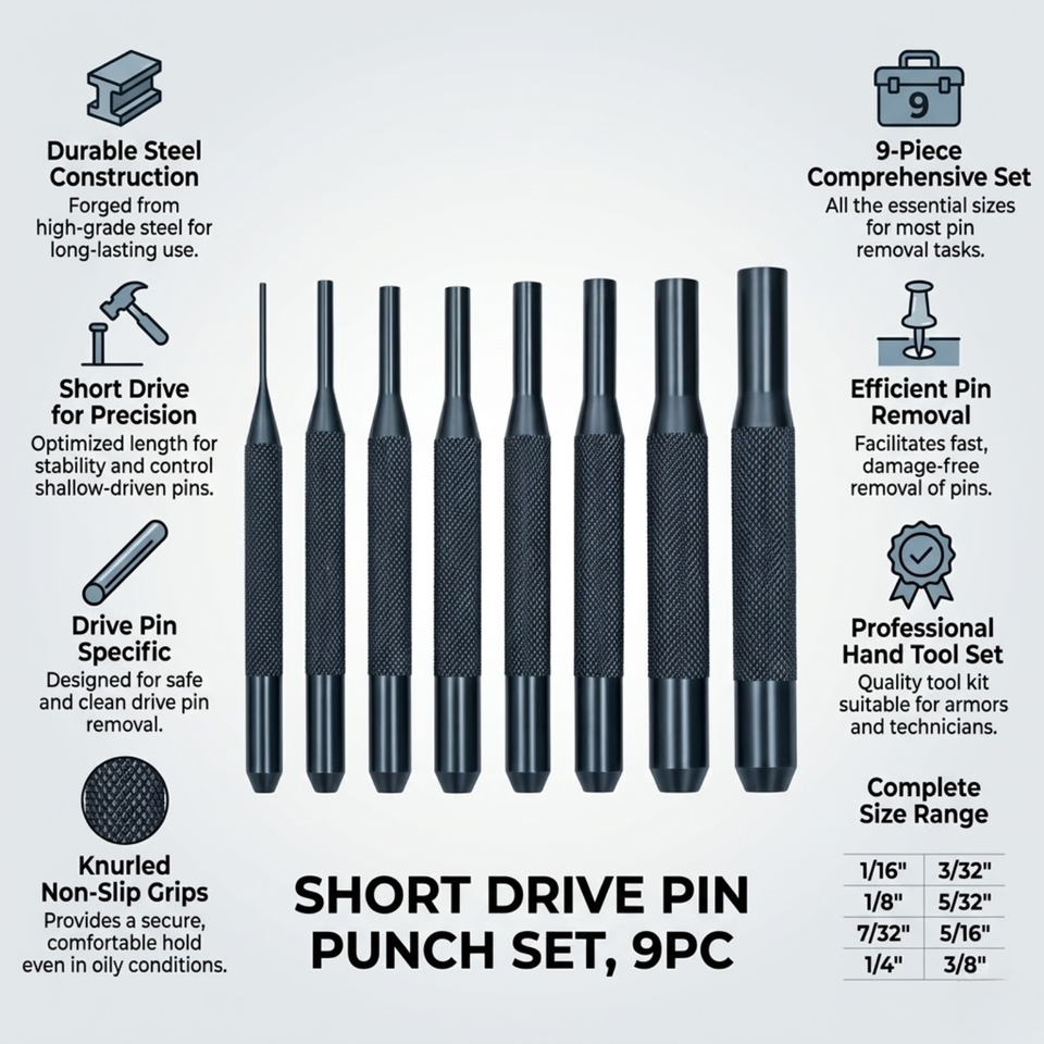 Jeu de 9 poinçons courts pour vis sans tête | Kit d'outils de poinçonnage en acier trempé pour broches | Réparation automobile - Démontage | Professionnel | Outils à main