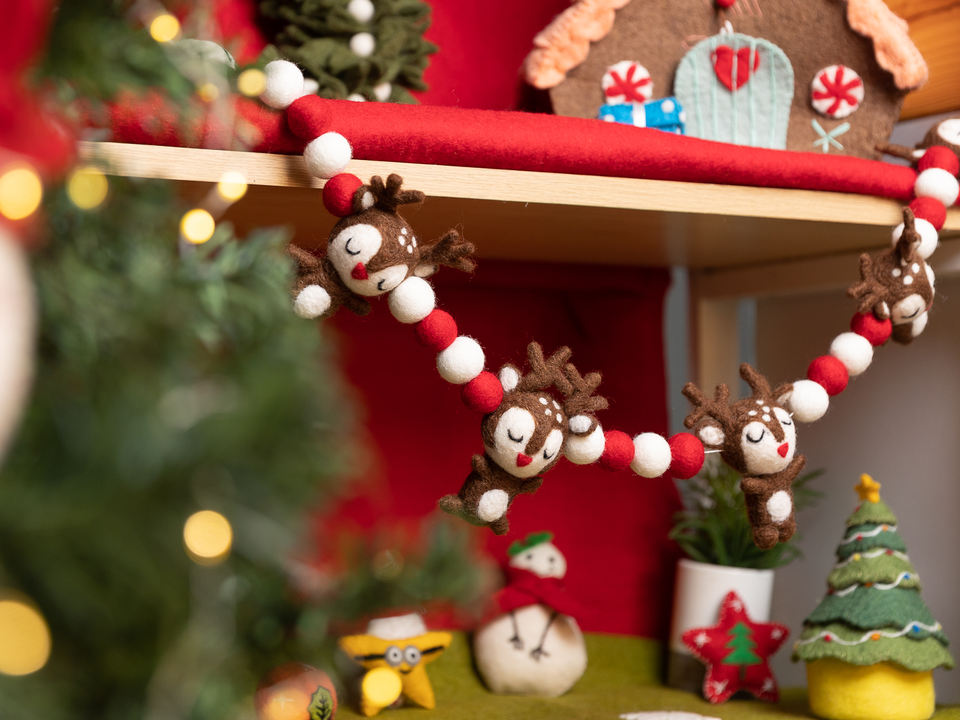 Ornement suspendu de renne en laine de 9x4cm Article décoratif de Noël adapté aux enfants purement feutré à la main par l'artisan népalais