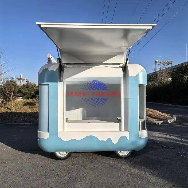Un camion de restauration mobile entièrement équipé proposant des hot-dogs, des glaces, des pizzas et des plats rapides, doté d'une cuisine complète.