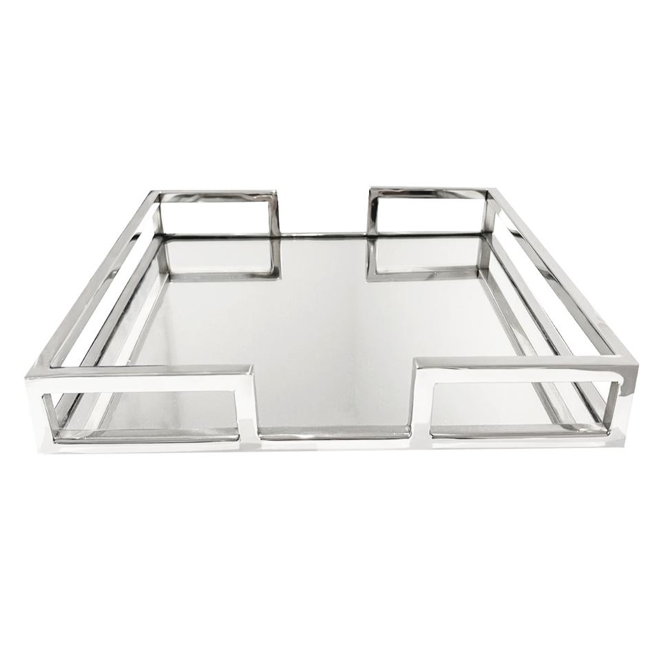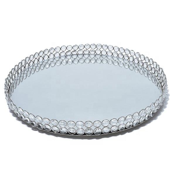 Plateau de service rond en nickel et fer décoratif A. H., fait à la main, diamètre 40 cm, avec finition brillante et bordure en cristal perlé