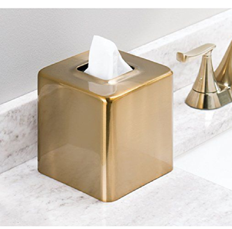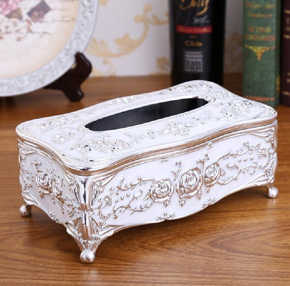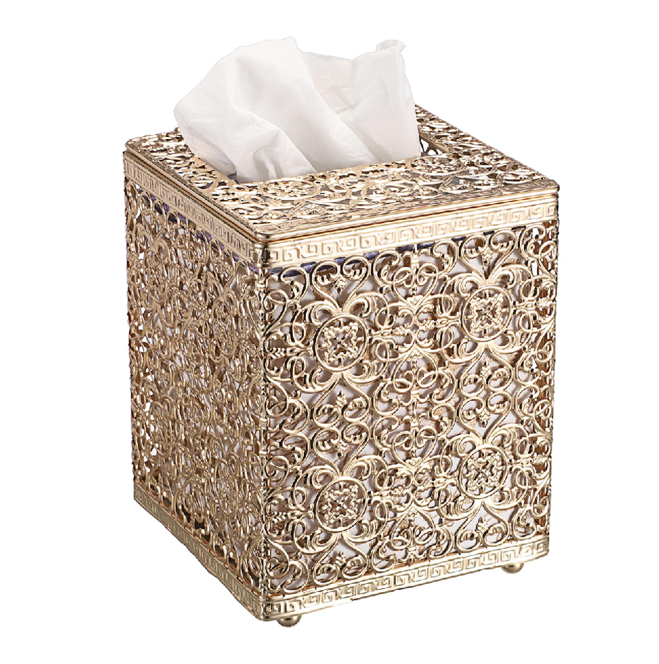 Une boîte à mouchoirs rectangulaire en métal maillé doré, ornée de roses et de feuilles dorées décoratives