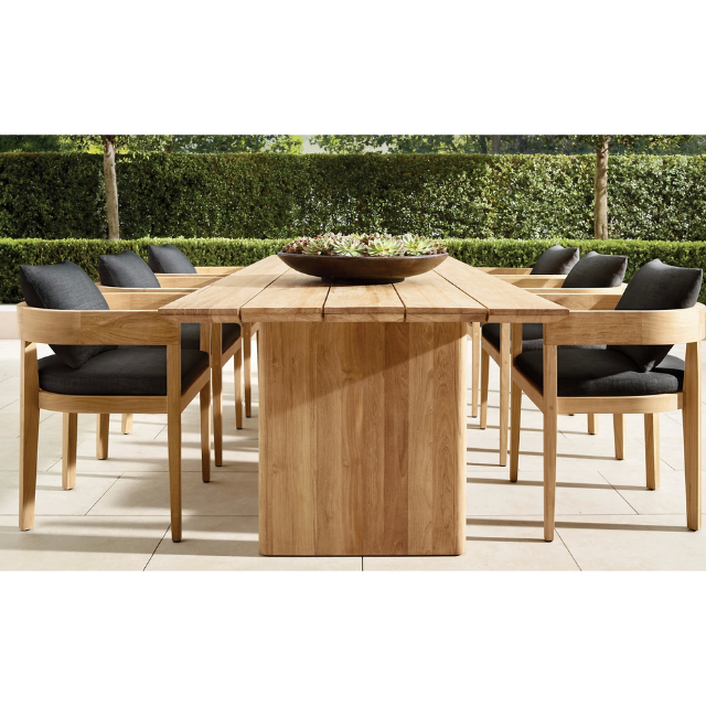 A teak wood chair with armrests in a simple, modern style for outdoor use, equipped with soft foam