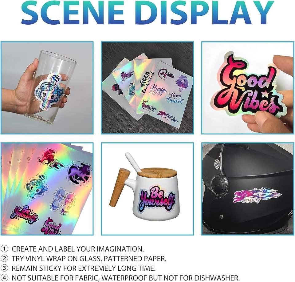 Papier Autocollant Vinyle Holographique A4 pour Imprimante Jet d'Encre et Laser, 20 Feuilles Imperméables et Auto-Adhésives 8,5 x 11 Arc-en-Ciel, Promotions, Épicerie
