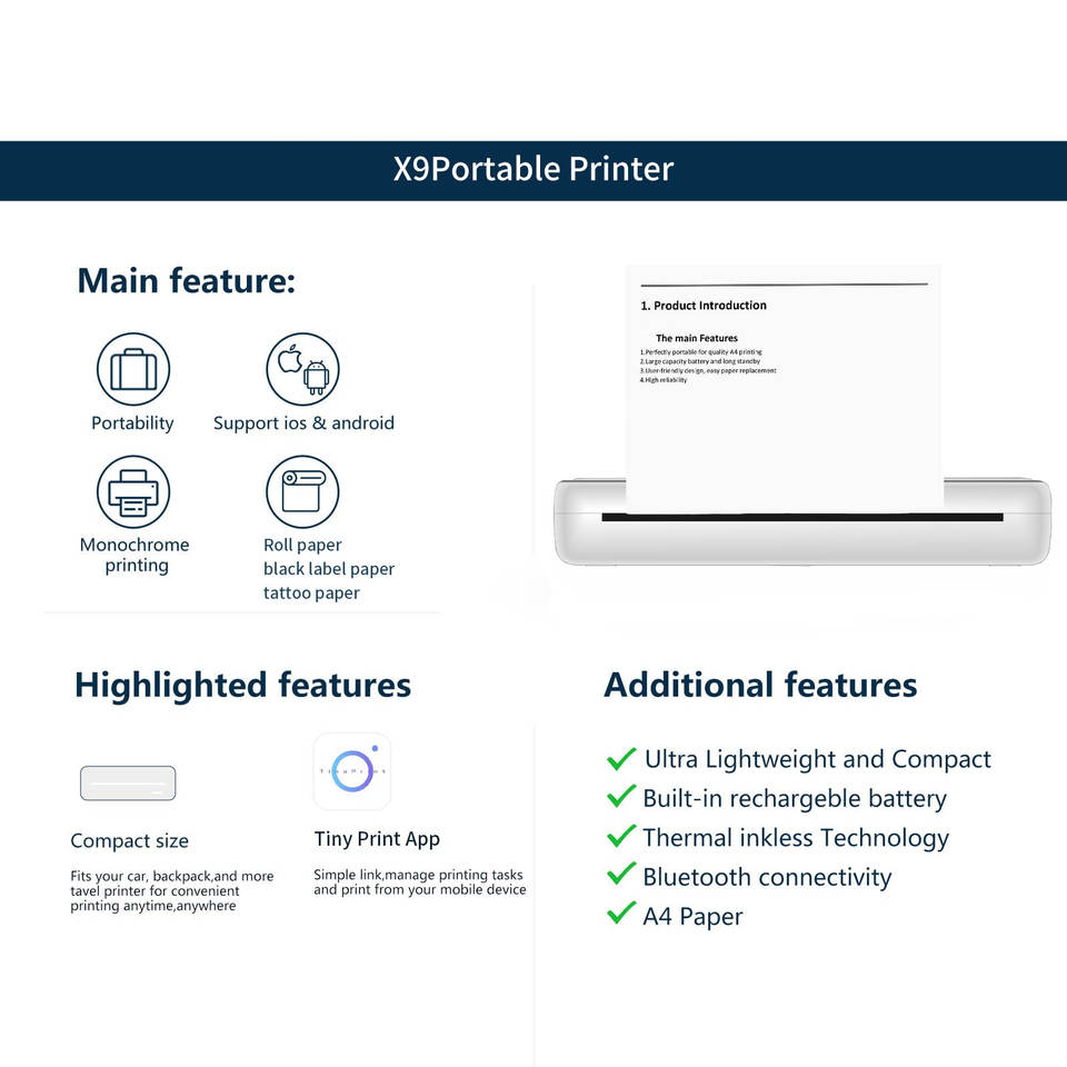 Imprimantes portables A4 sans fil 200 DPI Mini imprimante sans encre Android IOS Imprimante thermique BT4.0 pour outils Bureau École