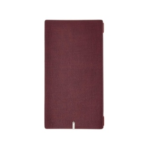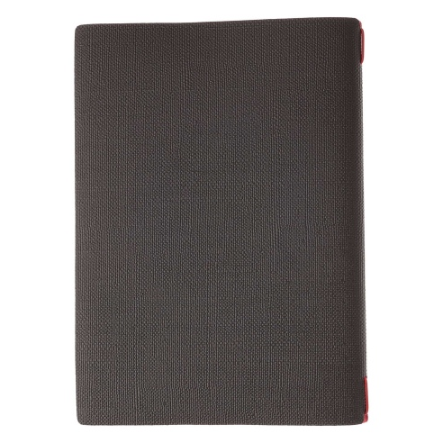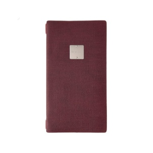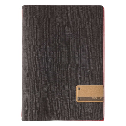 Porte-menu A4 slim (17,4x31,8 cm) étiquette métallique "menu" 2 poches (4 faces) élastique rouge jute bordeaux