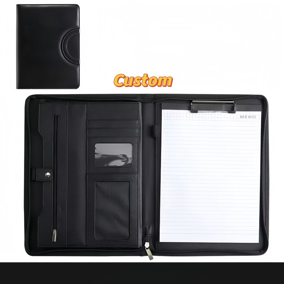 A5 B5 Logo personnalisé en feuille d'or sur le devant de la couverture Portefeuille en cuir PU gaufré en cuir noir avec fermeture éclair