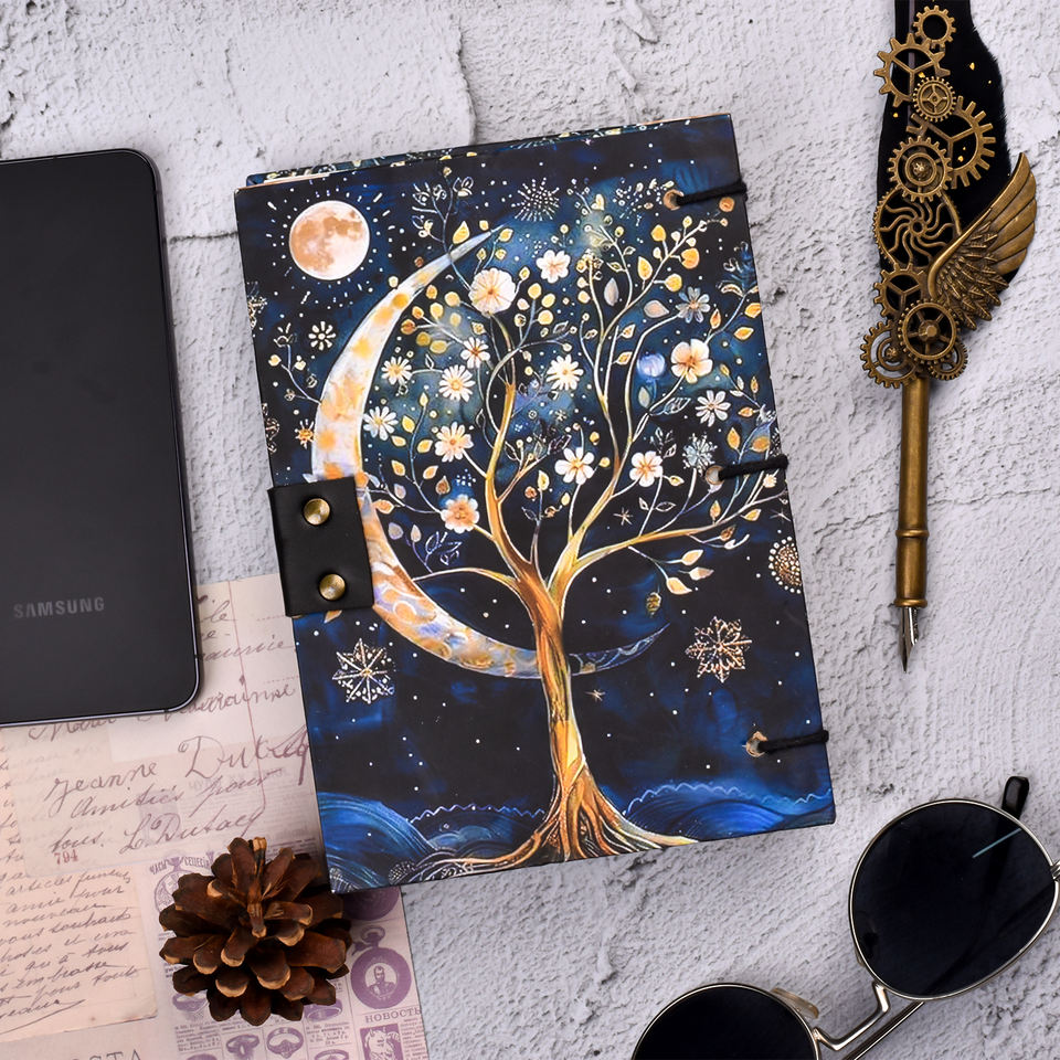 Carnet de notes A5 fait main en papier écologique, motif Arbre de Lune Céleste, 100 pages, écriture recto-verso, avec fermoir métallique, style vintage