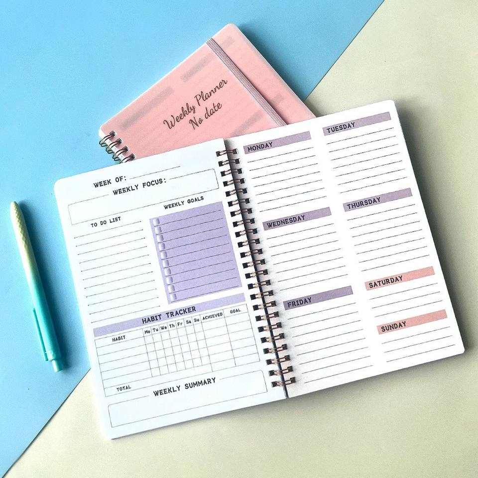 Planificateur hebdomadaire et annuel en anglais à ouverture latérale A5 avec cahier à reliure Wire-O pour étude de bureau