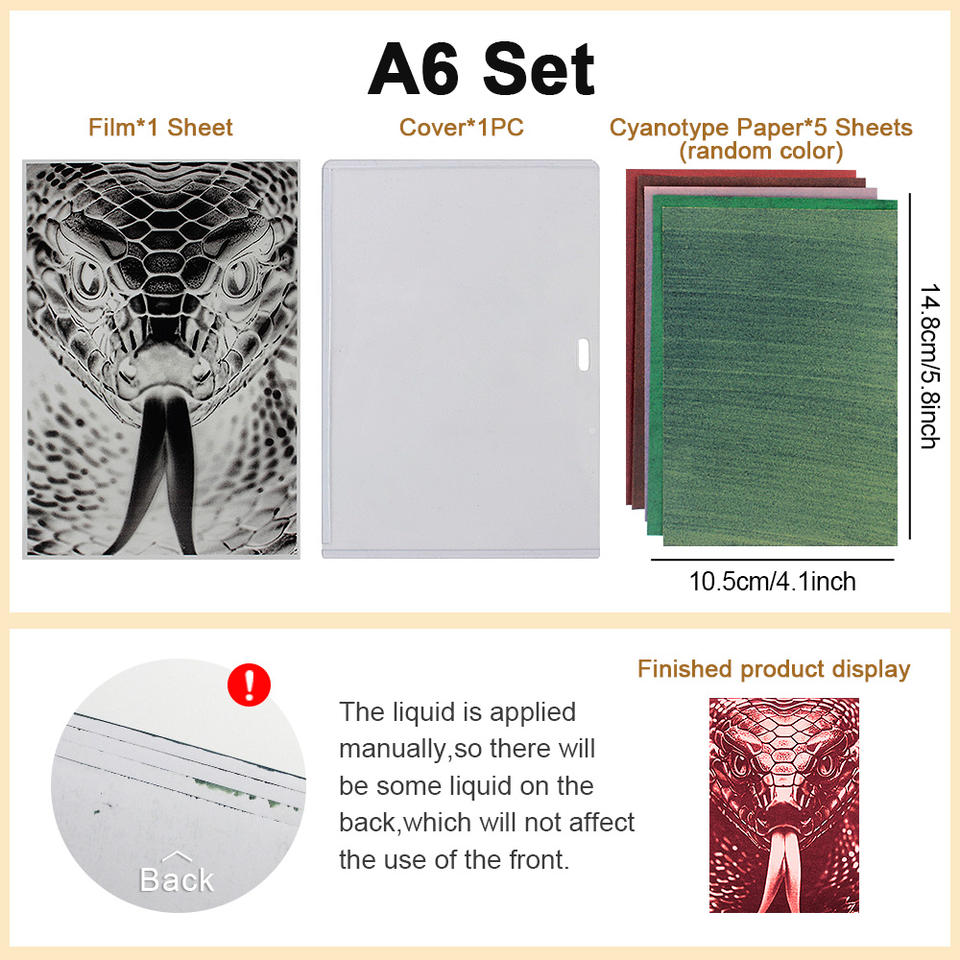 Kit de film de papier cyanotype pour impression solaire A6 avec tête de serpent 5 feuilles de papier d'impression solaire Tutoriel pour débutant DIY Art