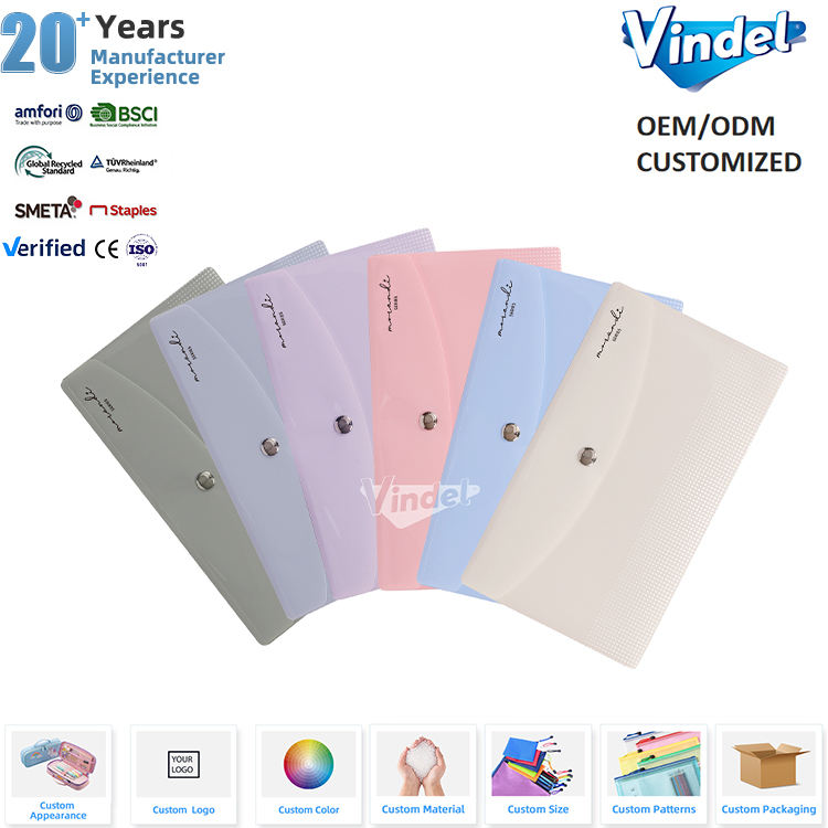 Enveloppes en plastique PP A6/DL, couleur Morandi, pochette à bouton pression, logo personnalisé, matériau papier, dossiers fins pour documents avec étiquette