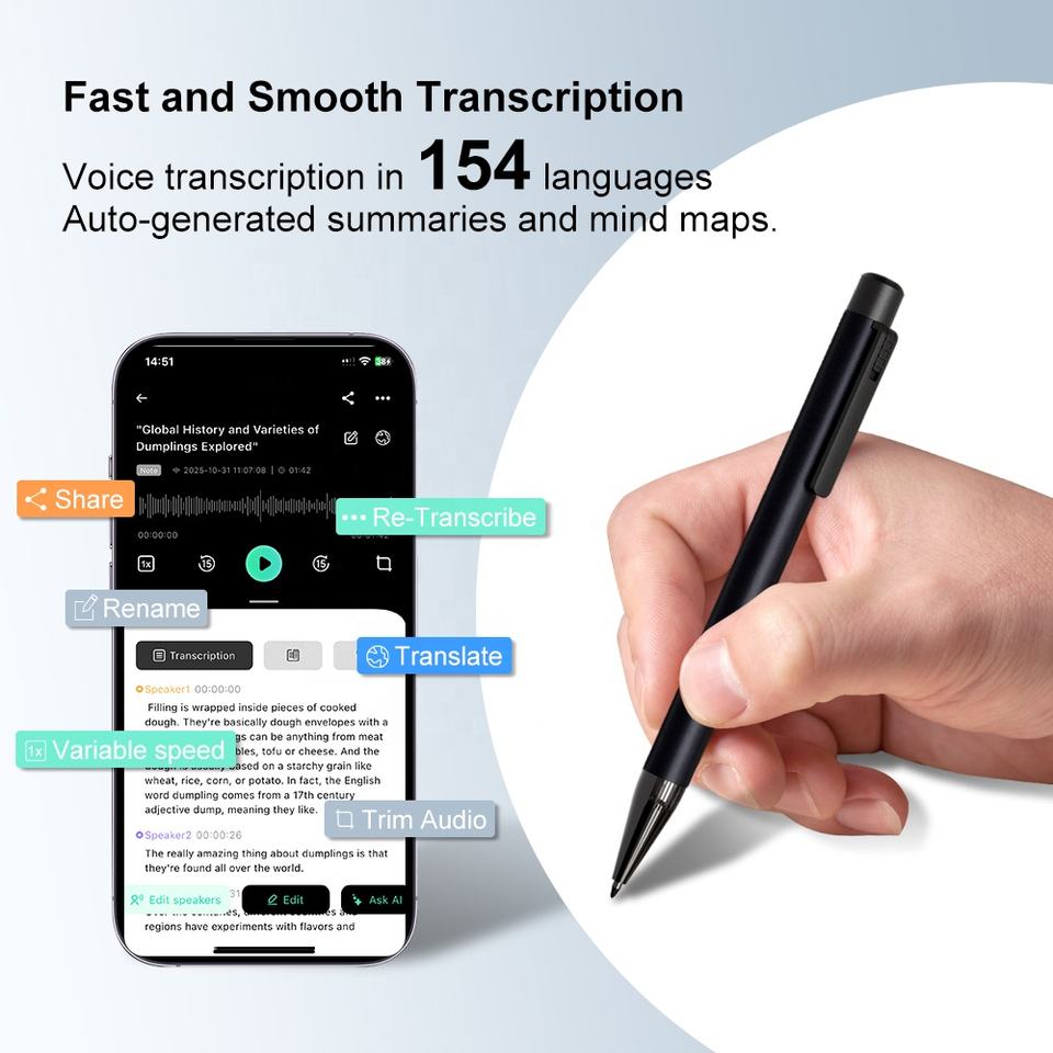 Enregistreur vocal et prise de notes IA prenant en charge 153 langues, transcription et résumé IA, enregistreur audio stylo 64 Go pour les réunions