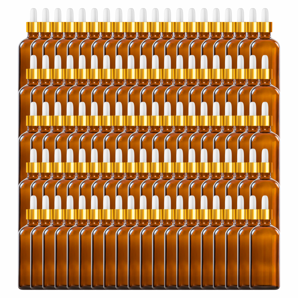 BOUTEILLE EN VERRE AMBRE, GOLDEN WHITE DROPPER, WHITE CAP,EURO DROPPER BOUCHE 18 MM