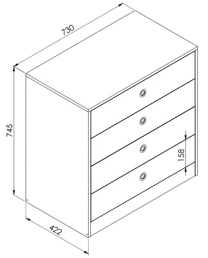 AMORE Armoire en bois à 4 tiroirs de style moderne Panneau de particules Chambre à coucher pour enfants École Blanc/Fumée Couleur Importée Brésil Patins métalliques