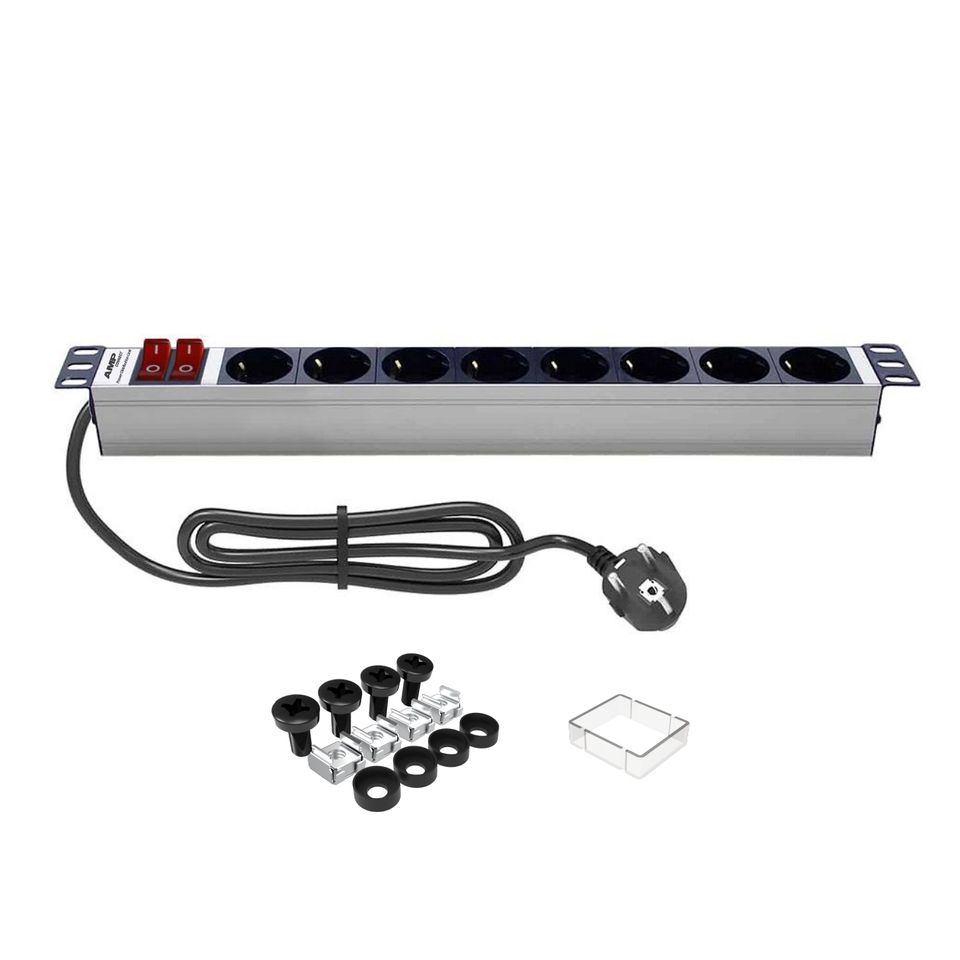 AMP CONNECT 1U 8 prises PDU Schuko allemandes avec interrupteur double marche/arrêt, montage en rack en aluminium, prise de type F (DIN49441) 16A 250V AC, garantie 2 ans