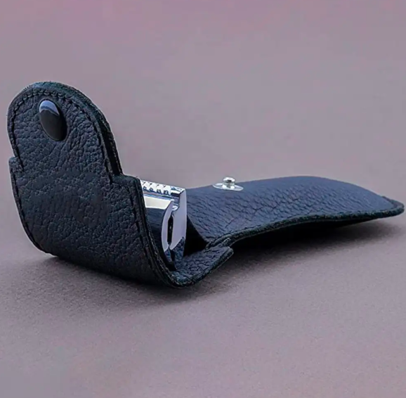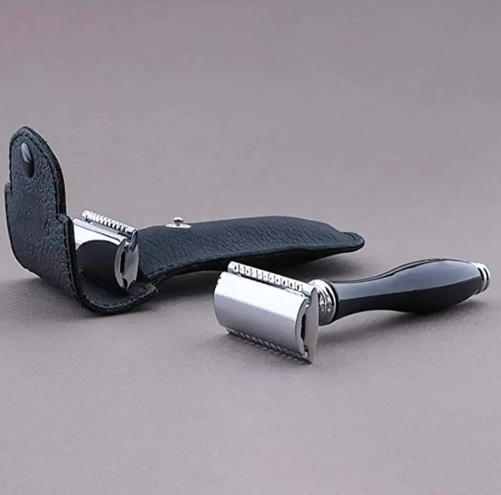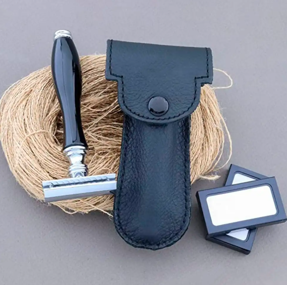 ANAAIF Rasoir de sécurité réutilisable pour hommes Manche noir tranchant avec couverture en cuir Usage personnel Poudre Forme
