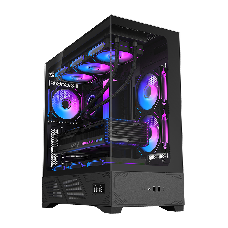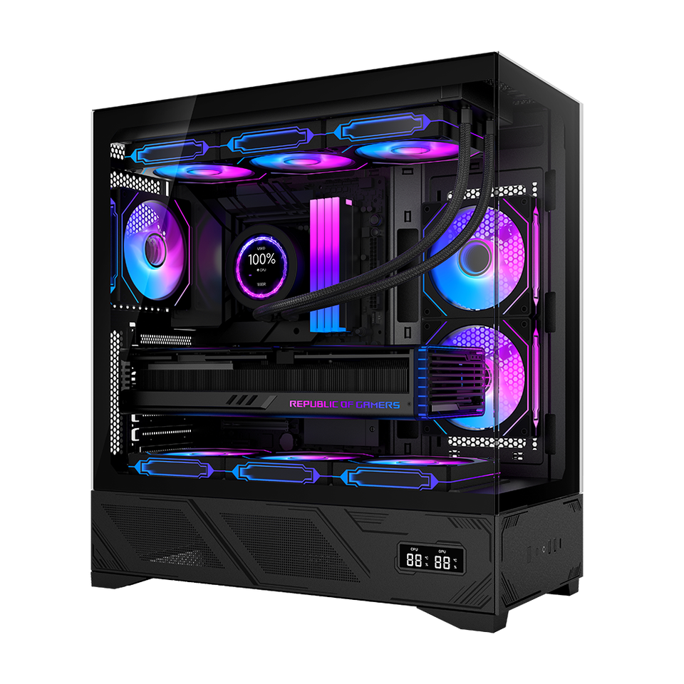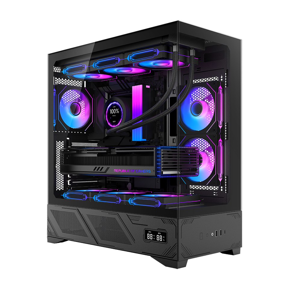 Boîtier de jeu PC AOJIE avec écran LCD, boîtier de jeu ATX de taille moyenne, boîtier de jeu Micro Desk, châssis de boîtier d'ordinateur en verre trempé