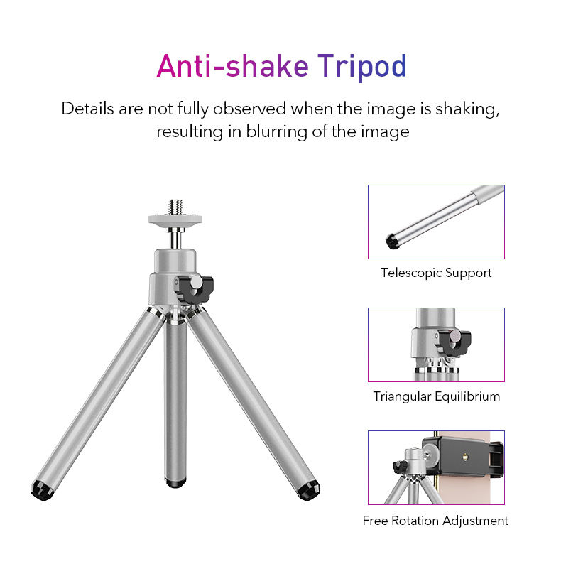Accessoires:Clip de téléphone, trépied, manuel d'utilisation, chiffon de nettoyage, gobelet en caoutchouc